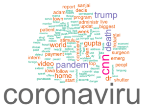 I like the idea of visualizing the most important words in a document using word clouds. Word clouds are the equivalent of plot, where the unit of data is a word. We’ll use the wordcloud() function, which requires a list of words and their corresponding frequencies. Let’s look at all the important words from the news source CNN. The box below shows how you can display all words with a TF greater than a certain threshold (used as a parameter):