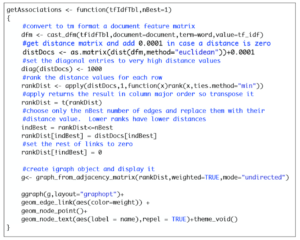 I have added comments in the code for getAssociations() to explain what each line is doing. The default value to the parameter nBest is set to one to indicate that only one closest document per row should be displayed in the graph but you can also set it to a different value. I am using Euclidean distance but you can use some other distance measure. Also, you can use correlation or another similarity metric to find the closest neighbor of a document. Of course, in that case, the closest neighbor would be the one having the highest similarity (rather than smallest distance). Calling this function in R shows the following graph: