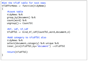 The last thing we need to extract are the statistics of words in each document. So here is a function to compute the tfidftable. We’ll make sure that we retain the category variable in the tfidftable by using the inner_join() function.